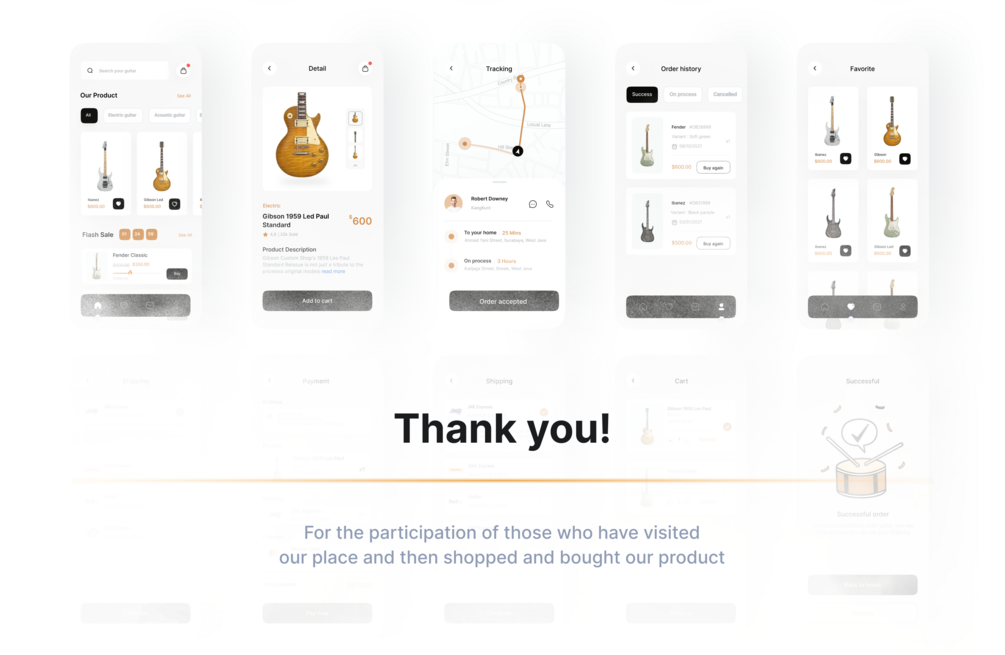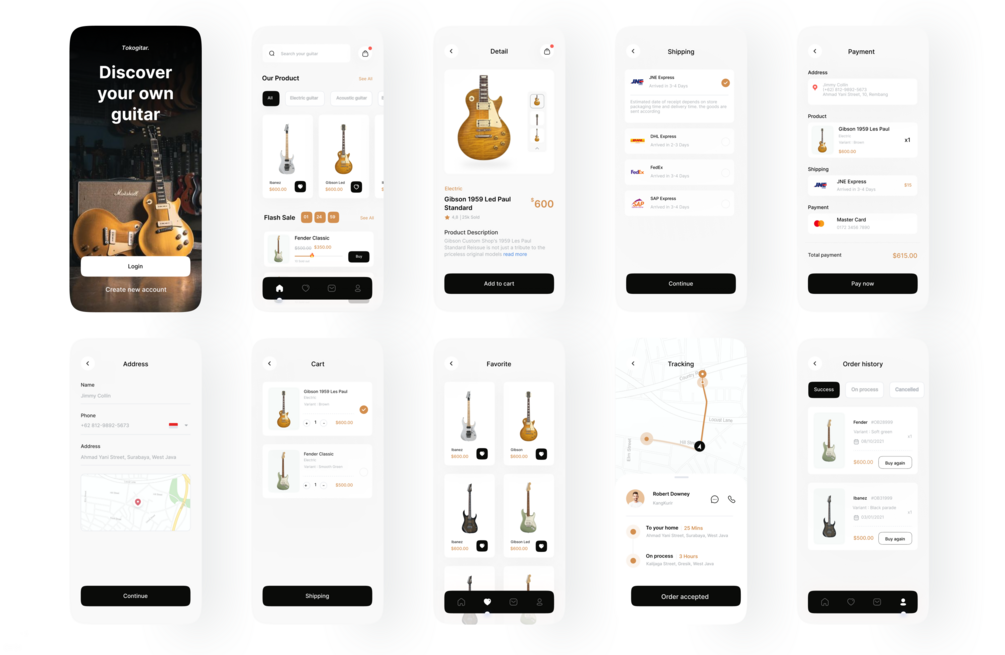At Tokogitar, we invite you to embark on a musical journey through our mobile e-commerce UI kit. Let your creativity harmonize with the digital realm as you create an unforgettable shopping experience for your customers. Join us in revolutionizing the way people explore and purchase their favorite musical instruments and accessories. Together, let's strike the perfect chord in the world of online commerce.